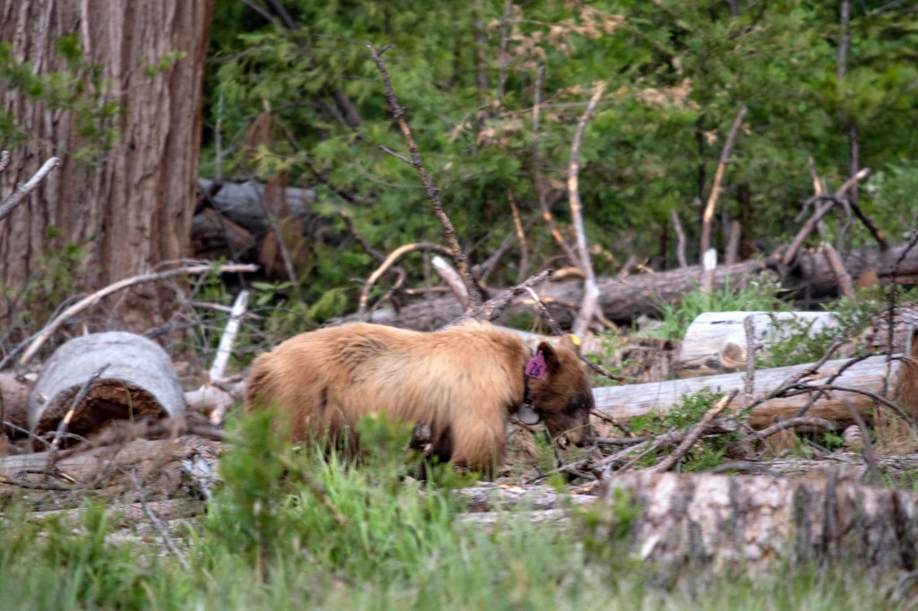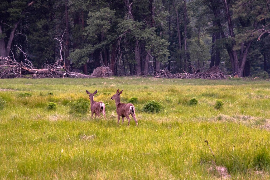 夏日独家去露营, 南北加州齐出行; 祖孙相聚优美地, 一家九口喜忘形。 途径隧道观全景, 多层瀑布下绿汀。 夕阳映红半圆顶, 熊鹿同田众人惊[1]。 【注】其实熊挺远的。是在一块很开阔的野草地上,中间有供游客步行的木板路,熊在路的东边,离我们至少有100米,我是让女儿跑回营地给我拿来600mm的长镜头才拍到的,熊的耳朵上还有26号的标签。两只小鹿在人行道的西边。一只小鹿穿过人行道一点点靠近熊,大家都捏一把汗,有人提议叫park ranger,也有点期待着会发生什么。不过,小鹿没走太远,突然竖起耳朵,持续至少一分钟,然后一步一步地离熊越来越远,再跑步穿过人行道,与西边的另一只小鹿团聚。这时天也黑了下来。